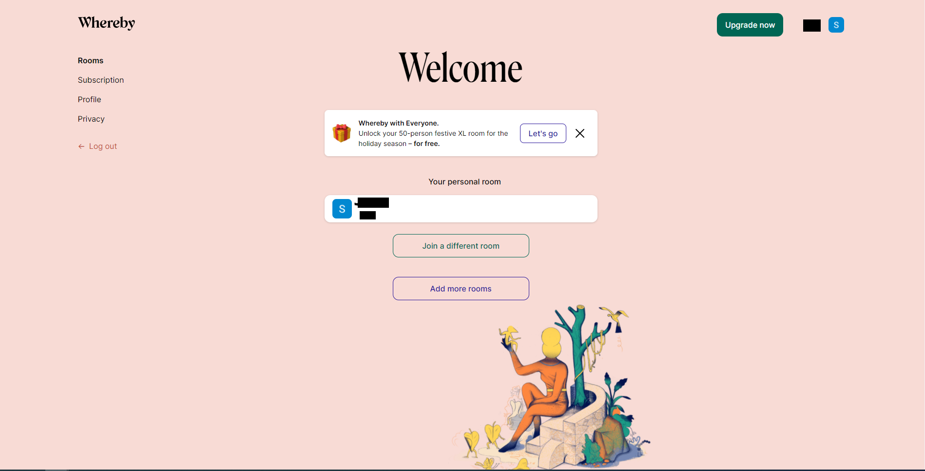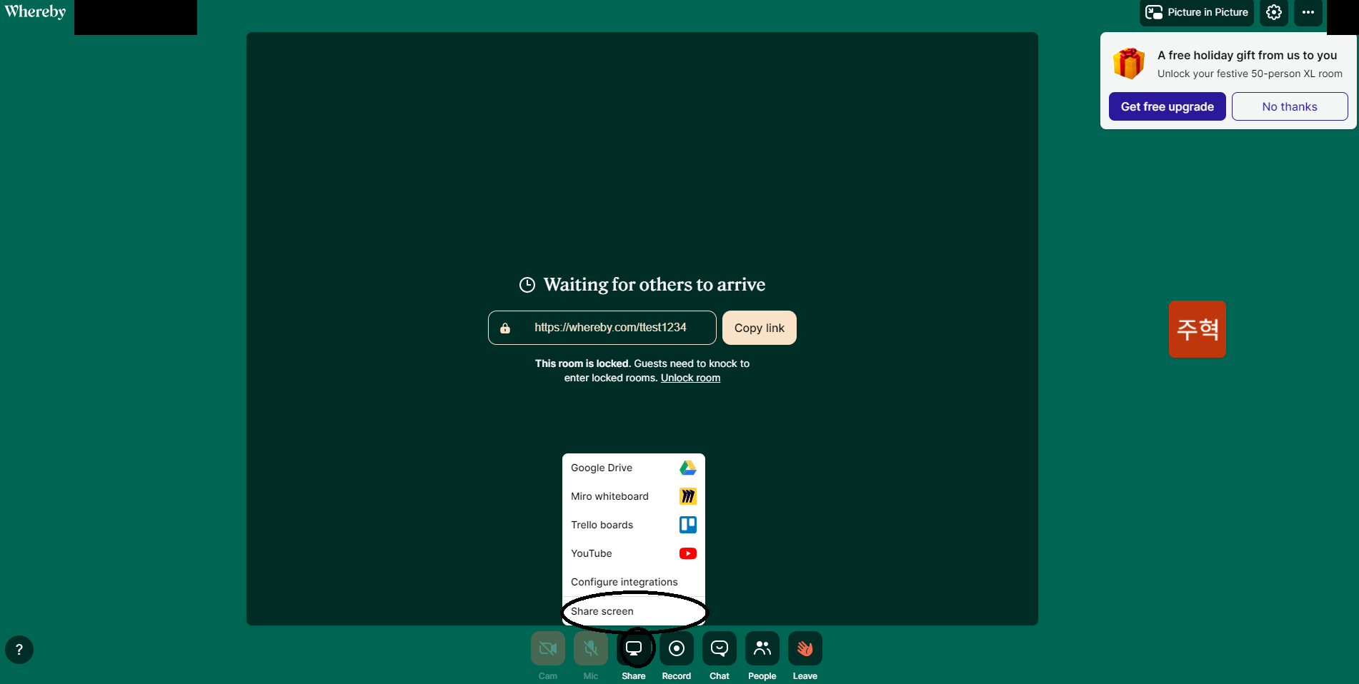 ex) room-name이 "testest1234"인 경우 whereby.com/test1234가 됩니다.